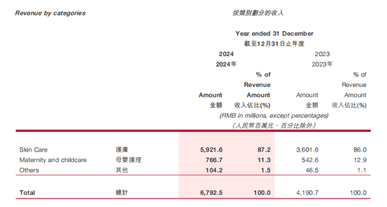 更进一步,其品类也呈现集中态势。上美股份2024年度报告显示,其护肤类收入为人民币59.22亿元,占比87.2%;母婴护理占比则为11.3%。