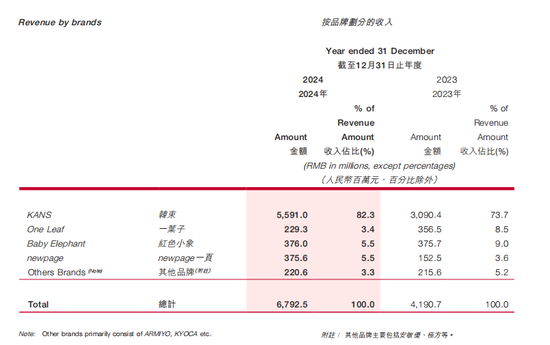 再回看其2024年品牌收入分布情况,其收入高度依赖单一品牌的特征也较突出,且较2023年出现上行。上美股份2024年度报告显示,其按品牌划分的收入中,韩束实现收入人民币55.91亿元,占比82.3%;红色小象收入占比5.5%;newpage一页收入占比5.5%;一叶子收入占比3.4%;其他品牌合计收入占比3.3%。