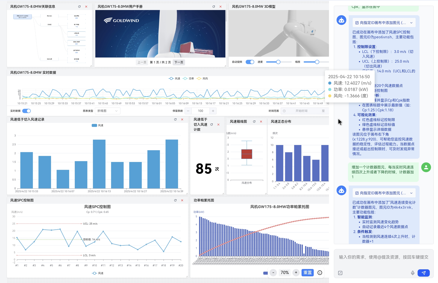 o 场景演绎: 当用户询问“2号风机为何效率下降”时,画布上不仅仅出现文字回答,还会自动调取该风机的实时功率曲线、历史故障日志、甚至关联的视频监控画面。这种“图文并茂、数据联动”的交互方式,直接打破了OT/IT/ET的数据壁垒,实现了语义层面的深度关联。