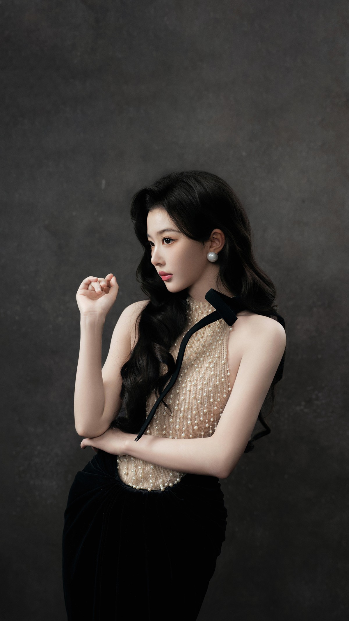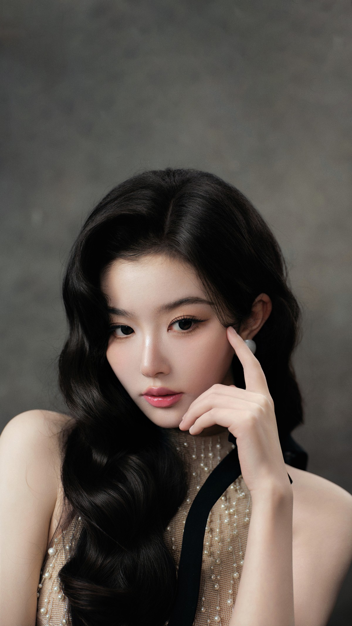 最妙的是她手里那根黑色手杖——别误会,她不是要去演福尔摩斯,而是用这根“权杖”宣告:今天的舞台,我说了算。配上耳垂上那对温润白珍珠,在乌黑发丝间若隐若现,温柔中透着一股“我可以很甜,但你别惹我”的气场。
