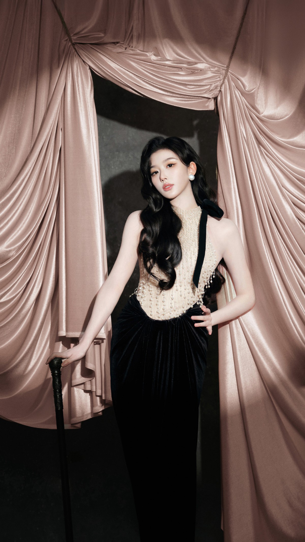背景那片粉色绸缎幕布也不是随便挂的,它像一场精心编排的梦境,柔光流转,弧度优雅,仿佛下一秒就会有留声机响起《夜来香》。整个画面既梦幻又克制,复古却不老气,像一杯加了冰的陈年威士忌——醇厚,但入口清爽。