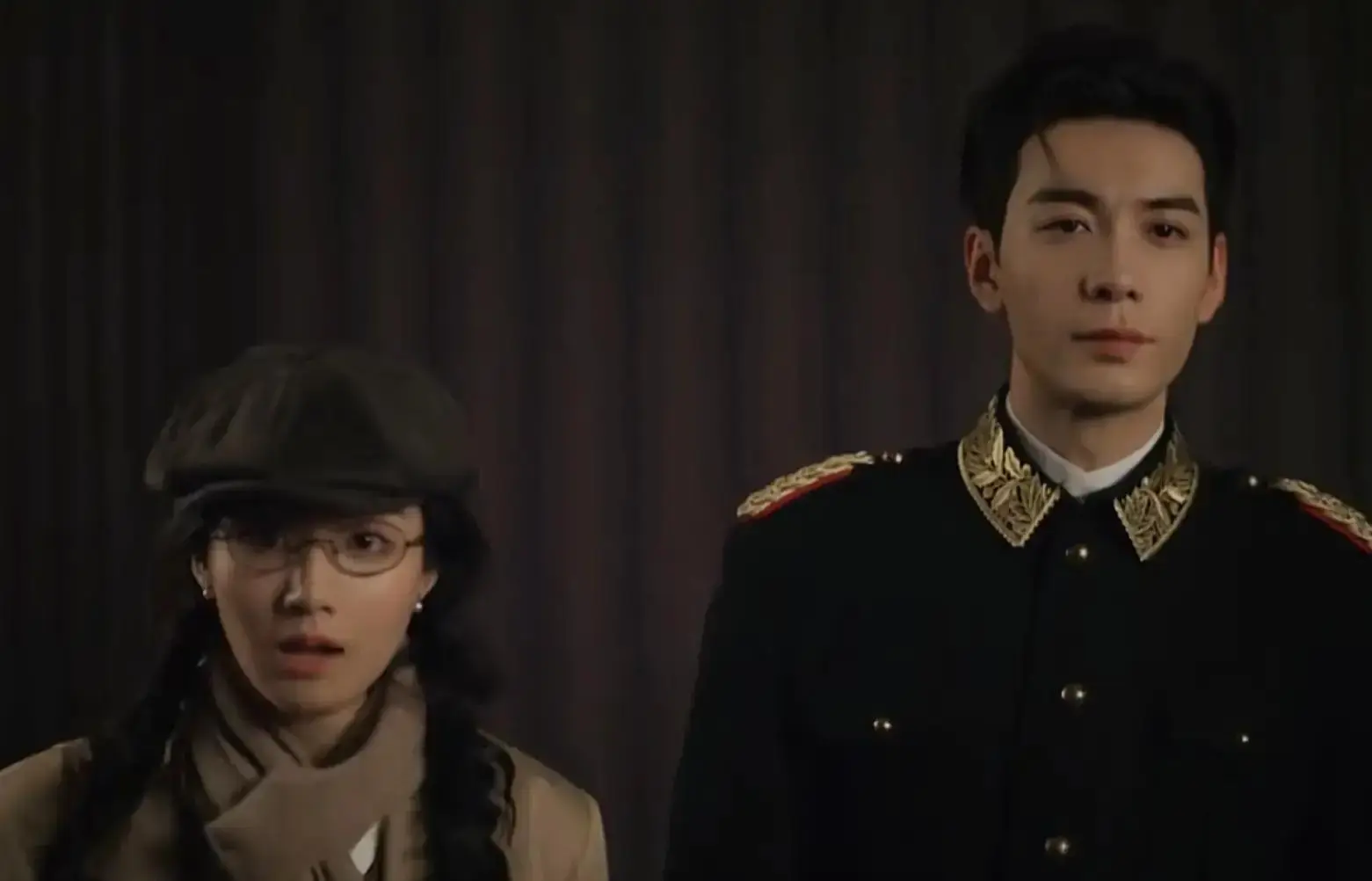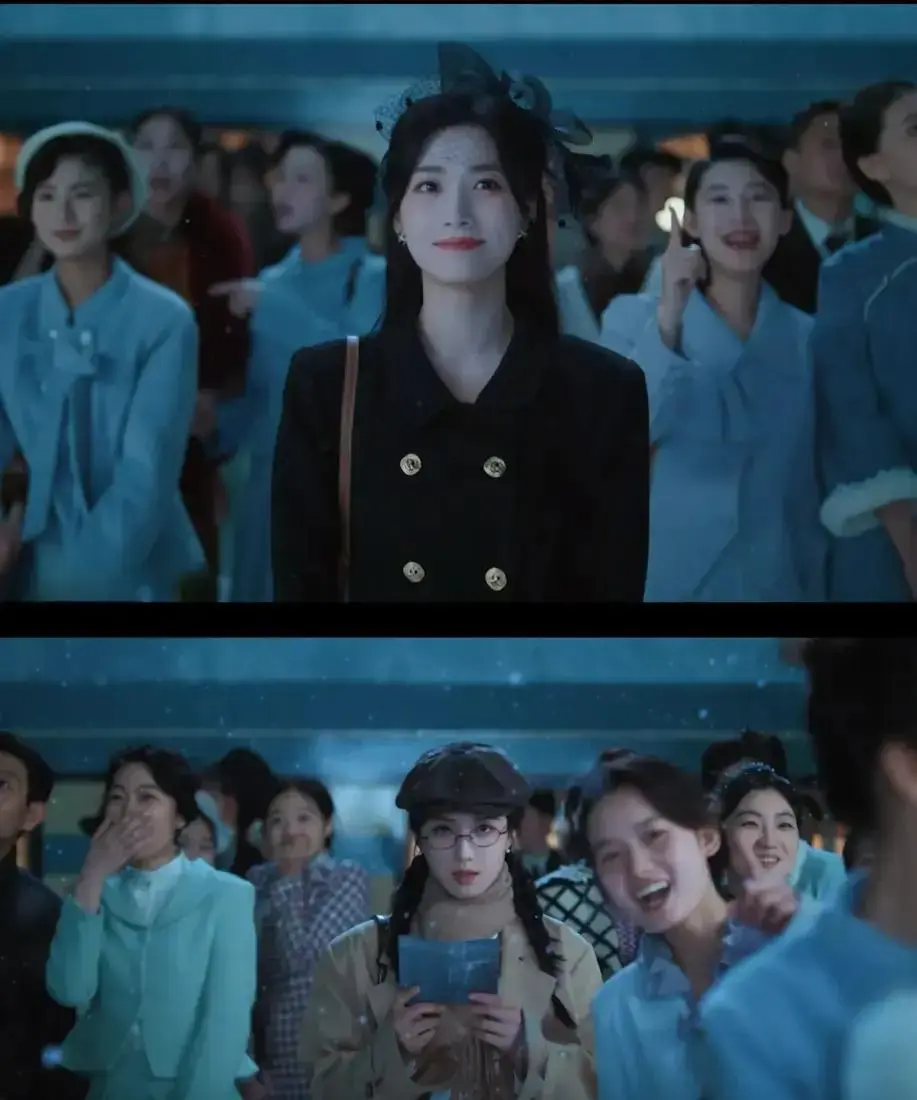 镜头一切换就是民国时期的长廊,女主换上旗袍站在台阶上,布景里摆着明显写着“1936”的海报,男主从楼下抬头看她,背景配乐节奏刚好卡在8小节的乐句上,导演用这种可见的时间标记,把“时空交错恋爱”的概念落实到每一次出场的走位和剪辑点里,而不是只停在设定介绍里。