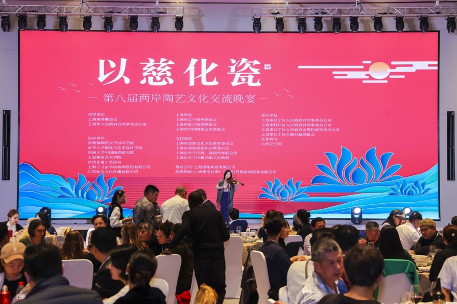 当晚,“以慈化瓷”主题晚宴在上海虹桥国际机场希尔顿酒店举行。舞蹈《青白瓷》、台湾民谣组曲、京剧、尺八演奏等节目轮番上演,两岸嘉宾在《我和我的祖国》《难忘今宵》的合唱中携手共舞,将气氛推向高潮。